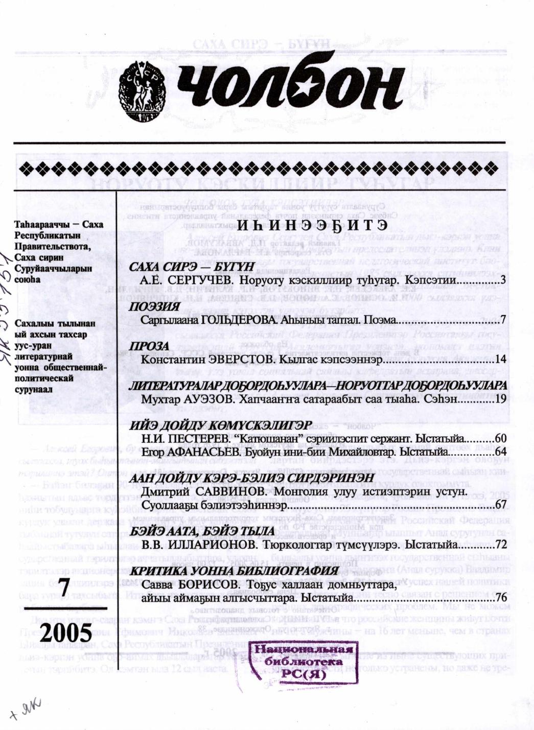 - 1. Чолбон: уус-уран литературнай уонна общественнай-политическай сурунаал, 2005, №1