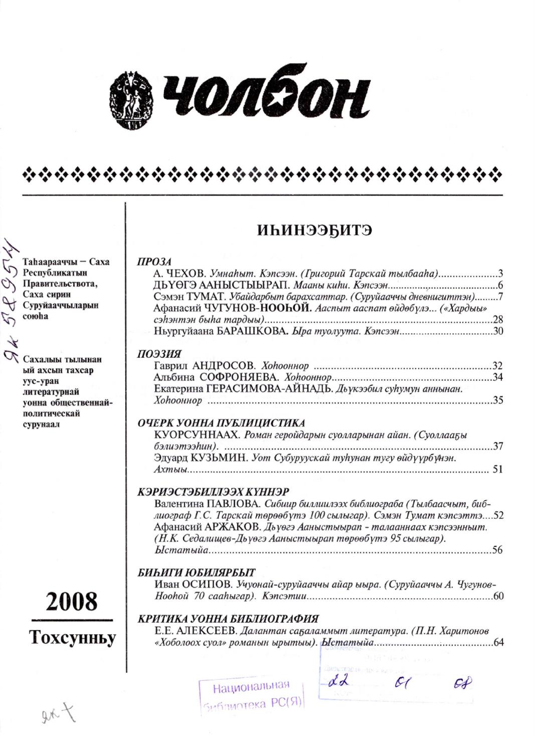 - 2. Чолбон: уус-уран литературнай уонна общественнай-политическай сурунаал, 2008, №3