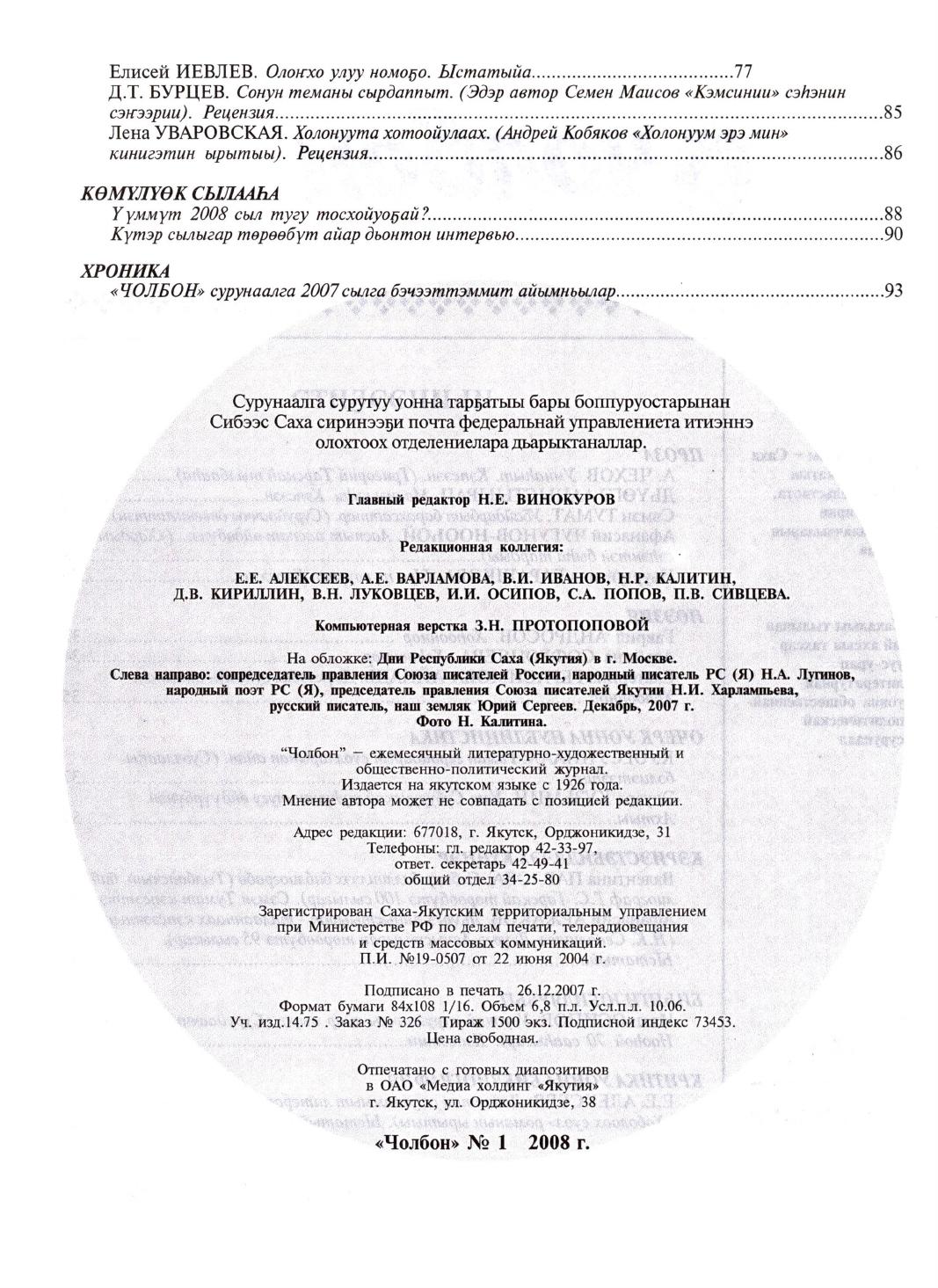 - 1. Чолбон: уус-уран литературнай уонна общественнай-политическай сурунаал, 2008, №2