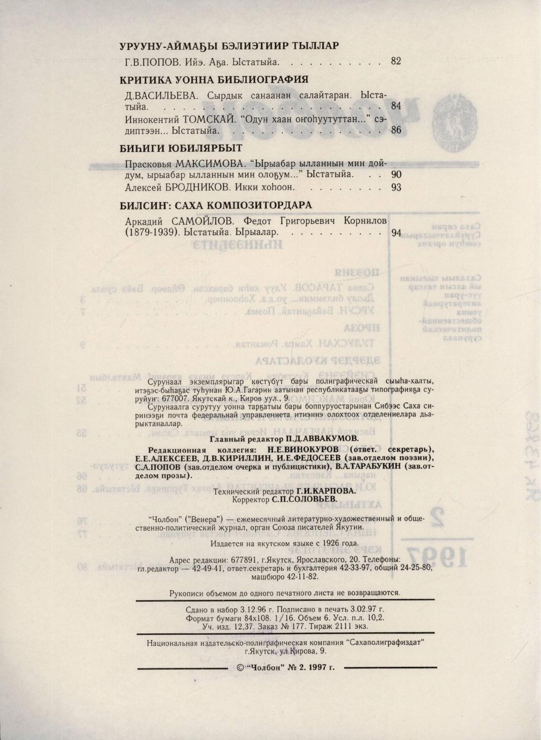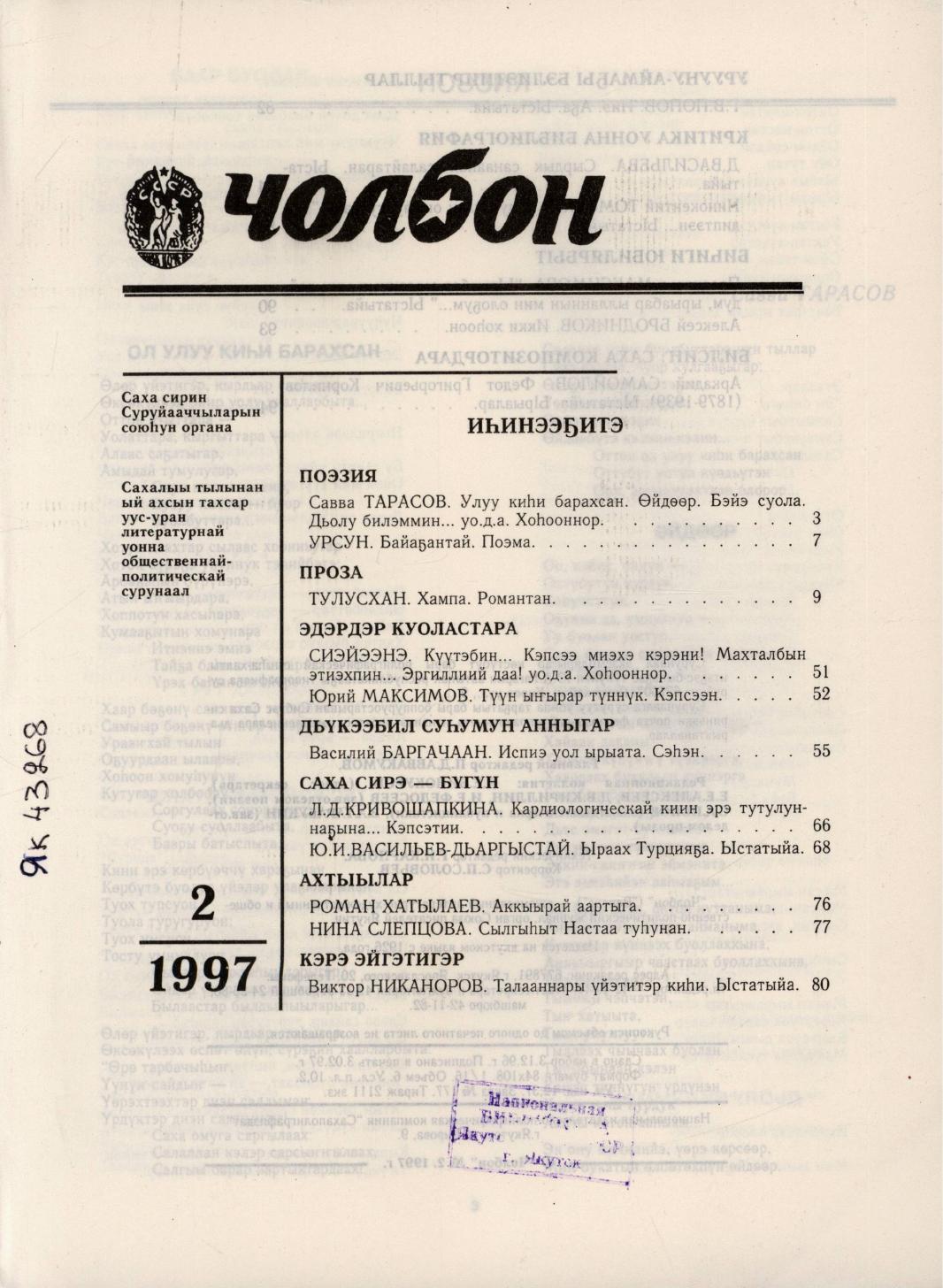 - 2. Чолбон: уус-уран литературнай уонна общественнай-политическай сурунаал, 1997, №3